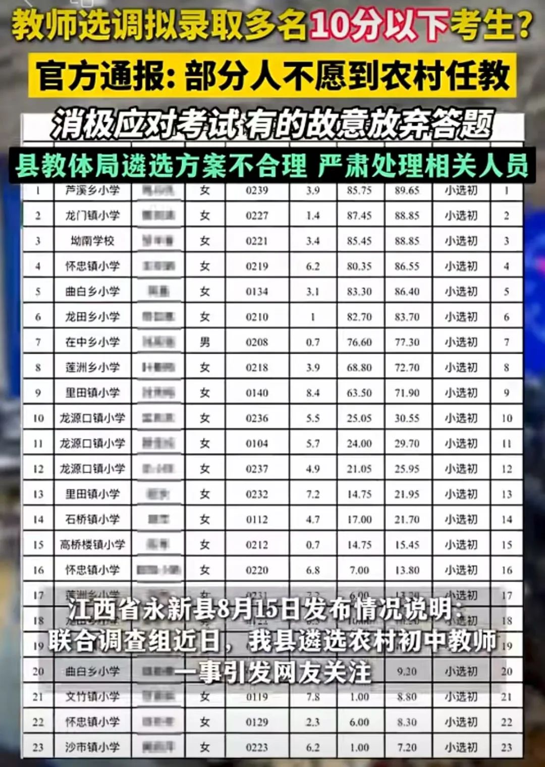 近日,江西永新县选调农村初中教师,拟录取多名10分以下考生一事引发网友关注。
