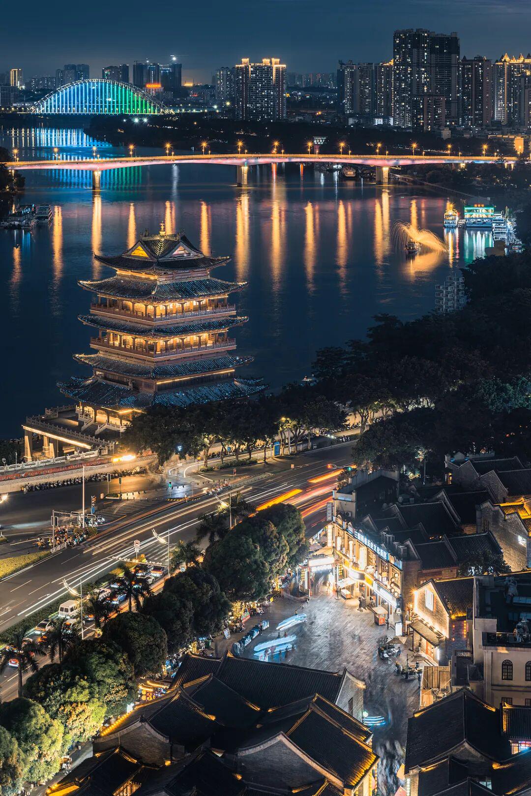 夜晚,从充满东南亚风情的水漾市集出发沿邕江漫步,矗立在江畔的畅游阁与灯火通明的大桥在视线中重叠。背景中,城市高楼闪烁的灯光,更增添了“赛博朋克”气息。