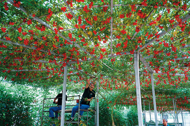 工作人员在位于山东省寿光市的寿光蔬菜高科技示范园养护“西红柿树”(2025 年 5 月 23 日摄) 徐速绘摄 / 本刊
