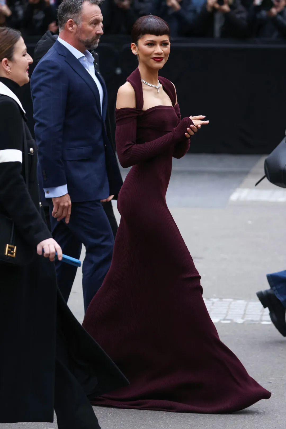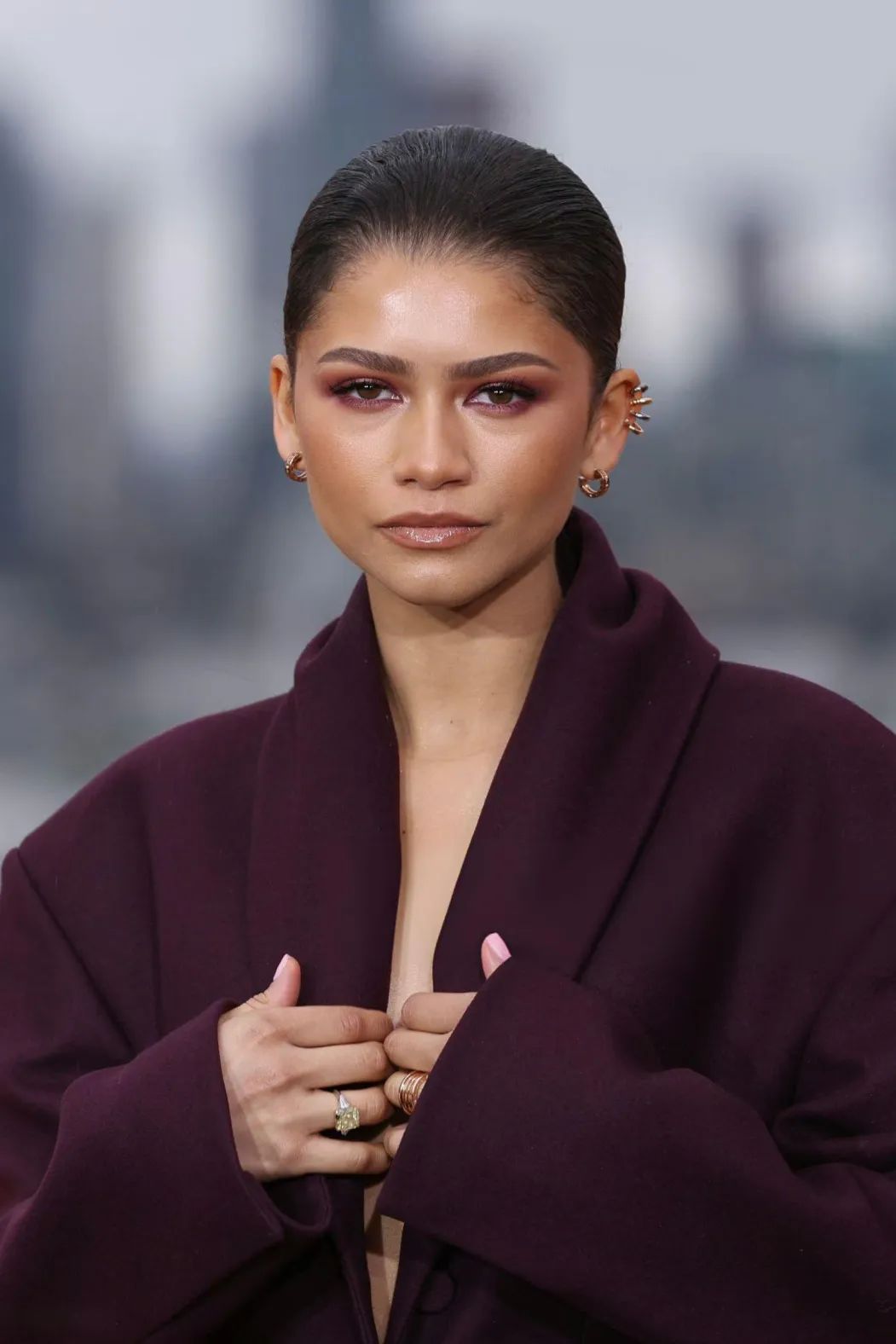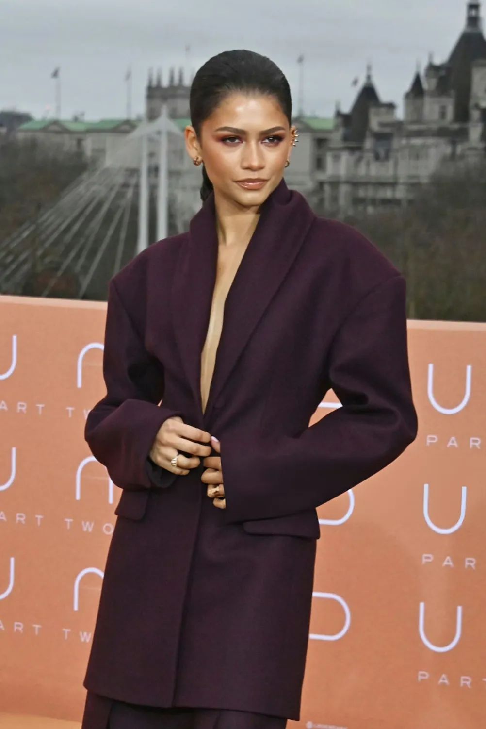 穿西装时, Zendaya 首选利落的背头发型,伦敦《沙丘2》首映活动上她还穿过一套酒红色的。