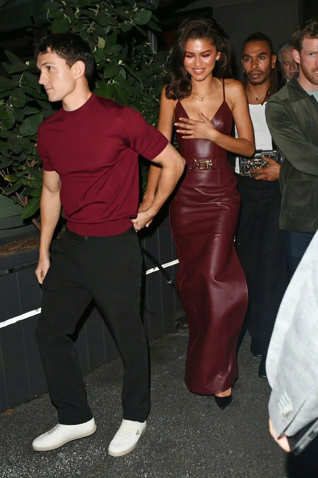 陪伴男友 Tom Holland 出席他的啤酒品牌活动时, Zendaya 也选了一条酒红色 Louis Vuitton 定制皮裙,两人还穿了同色系的情侣装,好甜!