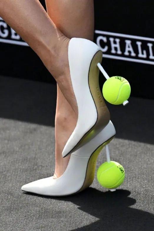 这套造型的一大亮点在鞋子上,扎着网球的鞋跟用“小趣味”呼应电影主题。