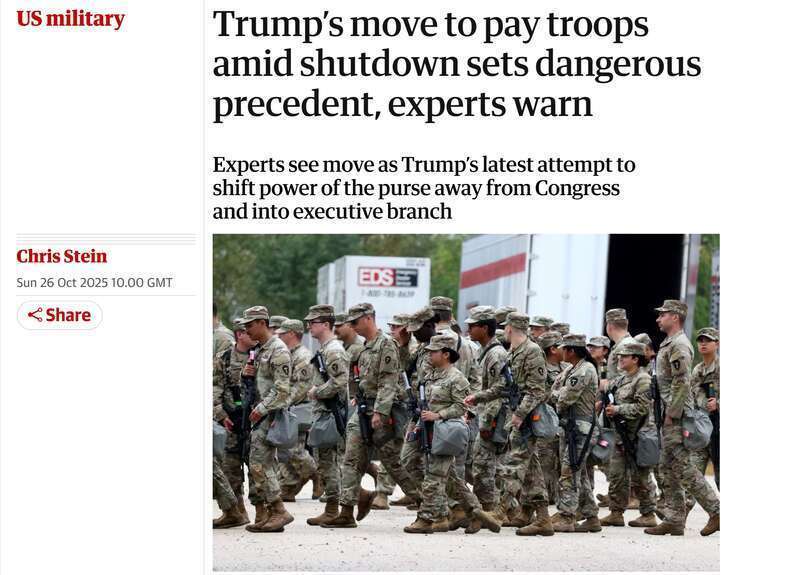 《卫报》指出,对执政的共和党来说,军人是不能牺牲的选民群体。因此,白宫自月初以来一直试图通过特殊手段确保军人在政府“停摆”期间也能正常拿到工资。不过,在部分法律学者看来,政府部门绕开国会的尝试威胁了后者控制公共支出的权力,若不加以限制,可能给更多有争议的行政措施奠定基础,例如在美国各大城市部署军队。
